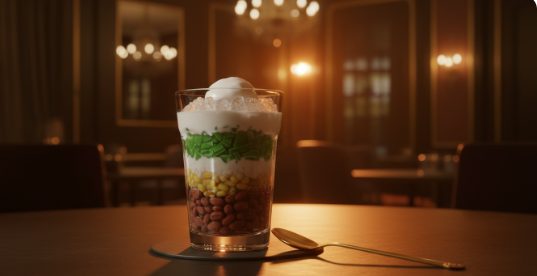 En vasos altos transparentes (para ver las capas), ensambla en este orden: CAPA 1: 3-4 cucharadas de frijoles rojos con su almíbar (fondo del vaso). CAPA 2: 3-4 cucharadas de judías mung con almíbar. CAPA 3: Puñado generoso de cubos de gelatina verde. CAPA 4: Llena el vaso hasta 3/4 con hielo picado, presionando ligeramente. CAPA 5: Vierte crema de coco fría sobre el hielo hasta llenar, dejando 1cm del borde. La crema se filtrará entre el hielo.